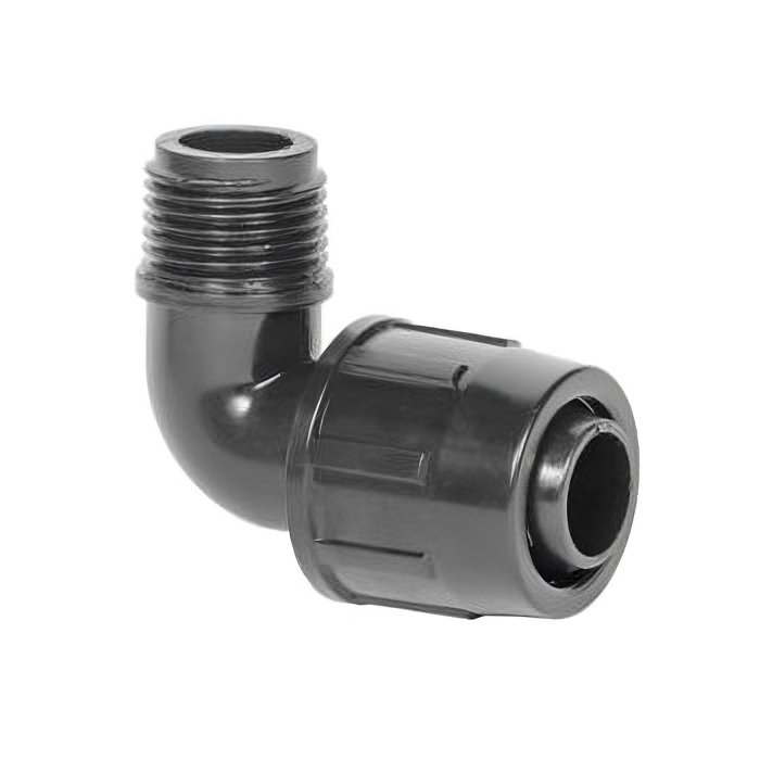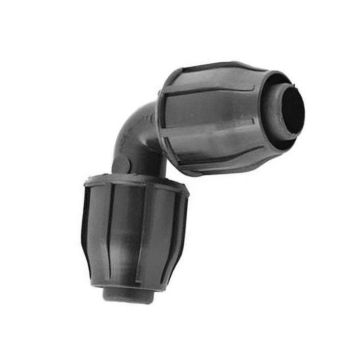 Hadicová spojka koleno je vhodná pre pevné spoje HDPE a LDPE trubiek pre závlahové systémy